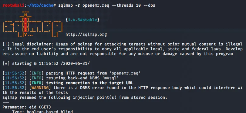 A Hack The Box Cache writeup covering web enumeration to find a hidden domain hosting a version of OpenEMR vulnerable to SQL injection and RCE to gain access to the machine, and then attacking memcached to gain root.