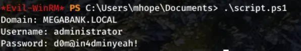 evil-winrm -i 10.10.10.172 -u mhope -p 4n0therD4y@n0th3r$