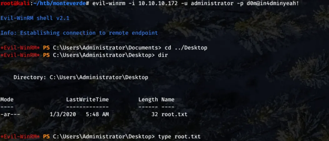 A Hack The Box Monteverde writeup covering Windows domain enumeration, password spraying, SMB share access, and exploiting Azure AD Connect to achieve domain compromise.