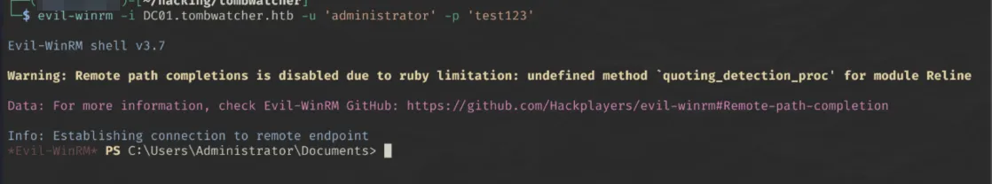 evil-winrm -i DC01.tombwatcher.htb -u 'administrator' -p 'test123'
