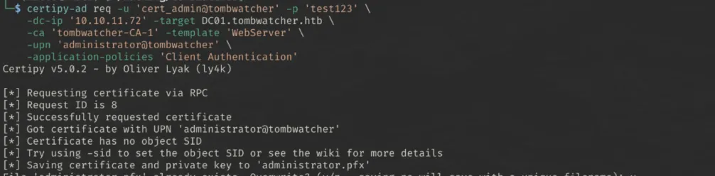 Since we know we’re dealing with a certificate account, we can use Certipy to enumerate for abuse-able certificates - hopefully allowing us to impersonate a domain administrator